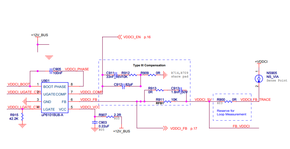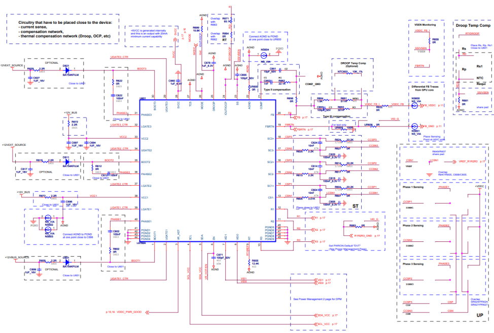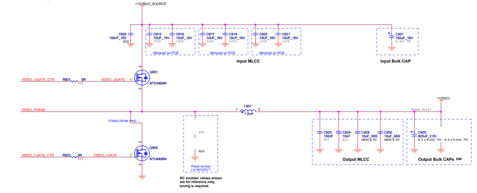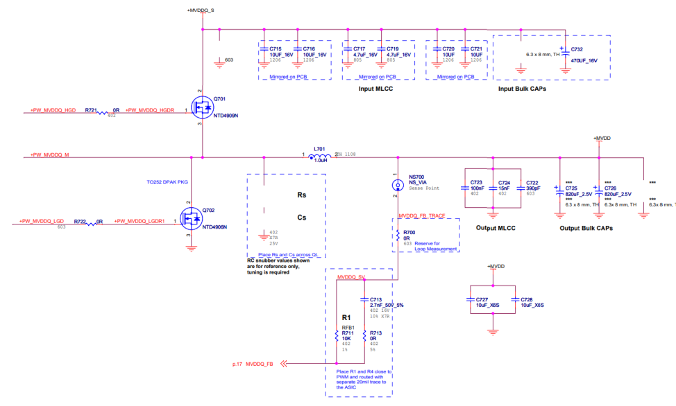 Контроллер U703 устанавливается так, чтобы LGate (pin4) был как можно ближе к затвору (gate) MOSFET-ов. Можно установить затворные резисторы R721 и R722 ближе к затвору MOSFET-ов. Проводящие дорожки к затворам (PW MVDDC LGD and PW MVDDC HGD) должны быть как можно более короткими и толстыми для уменьшения их сопротивления.