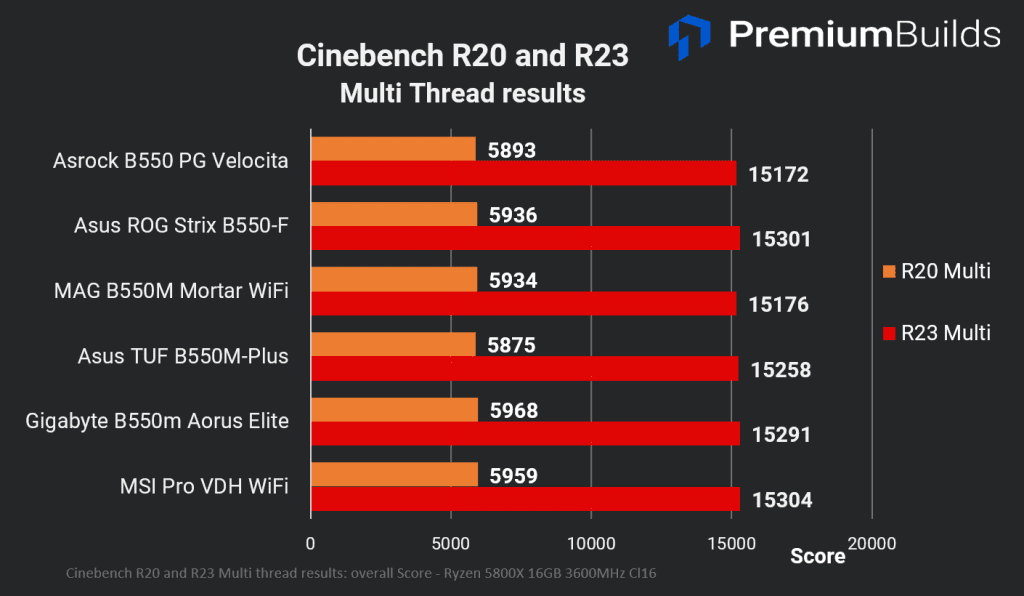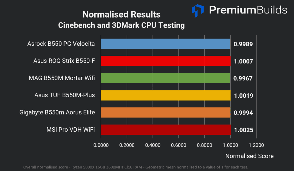 The long story short here is that we could not find any discernible difference in performance between any of these B550 motherboards. In single and multi-core tests they all performed remarkably closely, within a margin of error. In fact, if we normalise the scores and average them for each board we find a total variance of less than 0.2% – That’s well within the margin of error. They all held up well to longer duration testing, with no drop in performance after a 30-minute work loop.