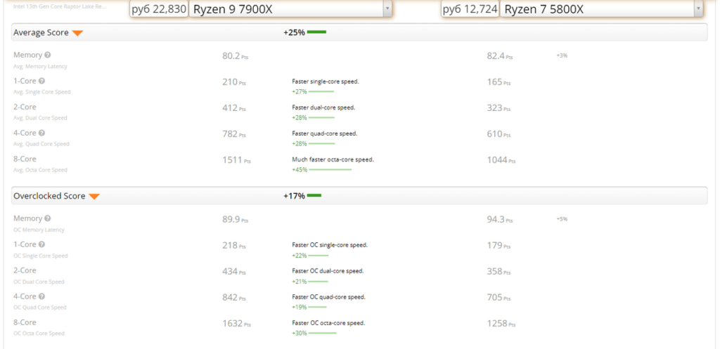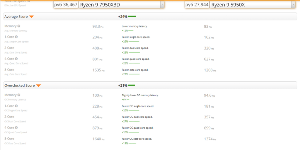 Для более наглядного и взвешенного выбора процессора для сборки игрового ПК в 2024 году, представим результаты сравнения производительности процессоров из нашей подборки с помощью лучшего сервиса сравнений: https://cpu.userbenchmark.com/