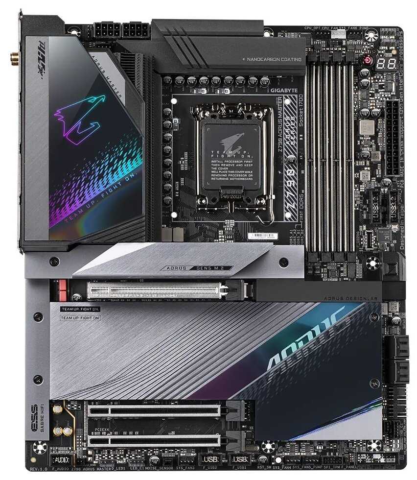 Z790 Aorus Master работает комплекты оперативной памяти DDR5. DIMM-слоты в конструкции также усилены. Главным достоинством Z790 Aorus Master станет отменный VRM. Он предполагает наличие 20+1+2 фаз, 20 из которых питаются ЦП мощностью 105А. VRM остается прохладным благодаря сложному радиатору, который закрывает систему подачи питания. Даже для нового Core i9-13900K понадобится только часть от этого, благодаря чему пользователь сможет разогнать свой ПК в дальнейшем. Среди других преимуществ – множество разъемов для вентиляторов и подсветка RGB. Кроме того, вы получите достаточный набор интерфейсов, в том числе Thunderbolt 4 и 2 порта USB-C. Также здесь есть 11 USB-слотов и Ethernet на 10 Гбит/с, который оптимально сочетается с 2 антеннами Wi-Fi-модуля 6E. При необходимости использования встроенного видеочипа предусмотрен специальный DisplayPort.