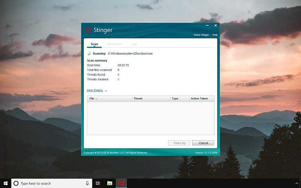 McAfee antivirus scanner allows you to quickly scan the selected location to search for potential malware. When the scan files McAfee Stinger generates a detailed report on the scan time, a number of checked files and the number of detected and removed threats.