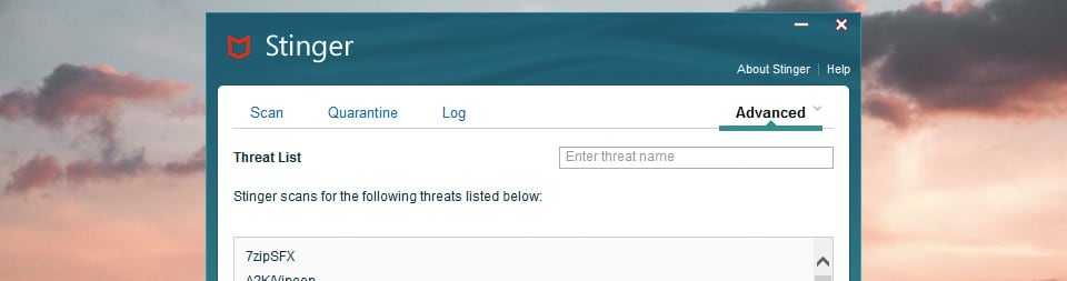 McAfee Stinger поставляется с технологией сканирования нового поколения, которая включает сканирование на наличие руткитов и оптимизацию производительности сканирования. Это позволяет ему быстро и эффективно выявлять и удалять угрозы, включенные в параметр «Список угроз» в меню «Дополнительно» в приложении Stinger.
