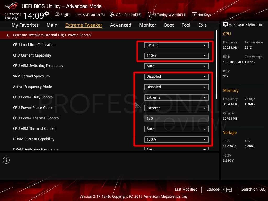 CPU Load-Line Calibration мы оставим на уровне 5 или 4. Это будет зависеть от того, что мы поставим, это будет больше или меньше напряжения в секции смещения. Текущая загрузка процессора составит 140%. Частота переключения CPU VRM мы сохраним в значение Auto. Расширение спектра VRM, которое мы отметим в активном частотном режиме, оставим его в режиме контроля мощности процессора и в фазе управления мощностью процессора, выберем контроль температуры процессора VRM, оставим его в параметре DRAM Current Capability, это необязательно, но если у вас есть быстрые воспоминания, я советую оставить его на уровне 130%.