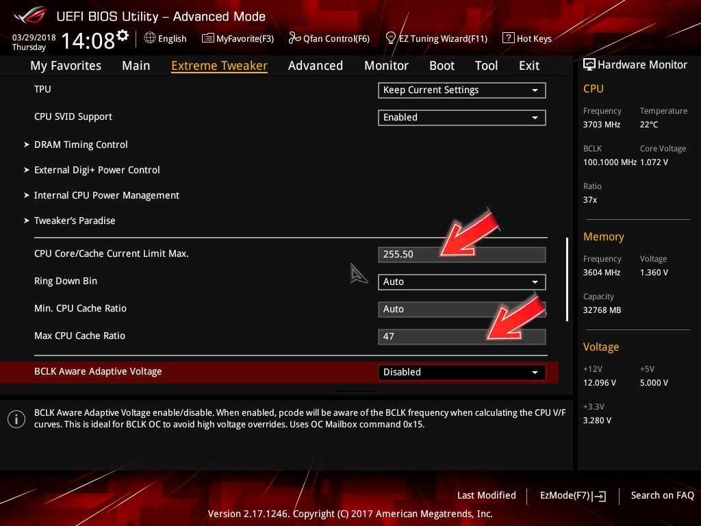 Поддержка CPU SVID мы оставим в Включенном. Максимальное ограничение тока ядра процессора / кэша Мы напишем максимальный предел 255.50 (очень важны эти данные). Ring Down Bin, мы будем держать его в Авто. Минимальный коэффициент кэширования процессора мы оставим по умолчанию в Auto. Max CPU Cache Ratio оставим кеш на 47, больше чем это значение, мы сомневаемся, что он стабилен. BCLK Aware Adaptive Voltage, мы оставим его отключенным.
