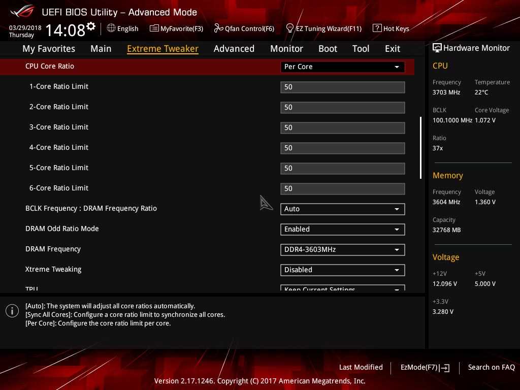 Соотношение процессорных ядер: мы можем выбирать между ядрами и всеми ядрами. Я всегда вкладывал это во все, но на этот раз я решил оставить все выделенное в 50 вручную. Наличие одного и того же значения дает нам один вариант, равный другому. Частота BCLK: Коэффициент частоты DRAM мы выберем Авто. DRAM Выбор нечетного режима включен. Частота DRAM: Мы оставим 3603 МГц (в вашем случае появится максимальная частота, которую ваша RAM может иметь под вашим профилем. Xtreme Tweaking мы выбираем Disabled TPU, мы выбираем Keep Current Settings
