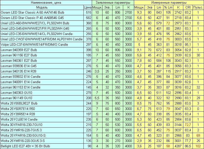 В таблице ниже приведены результаты тестирования двадцати шести светодиодных лампочек различных производителей. У именитых брендов Osram, Philips паспортные данные всегда соответствуют реальным параметрам. У других световой поток изделия может быть на четверть ниже заявленных параметров.