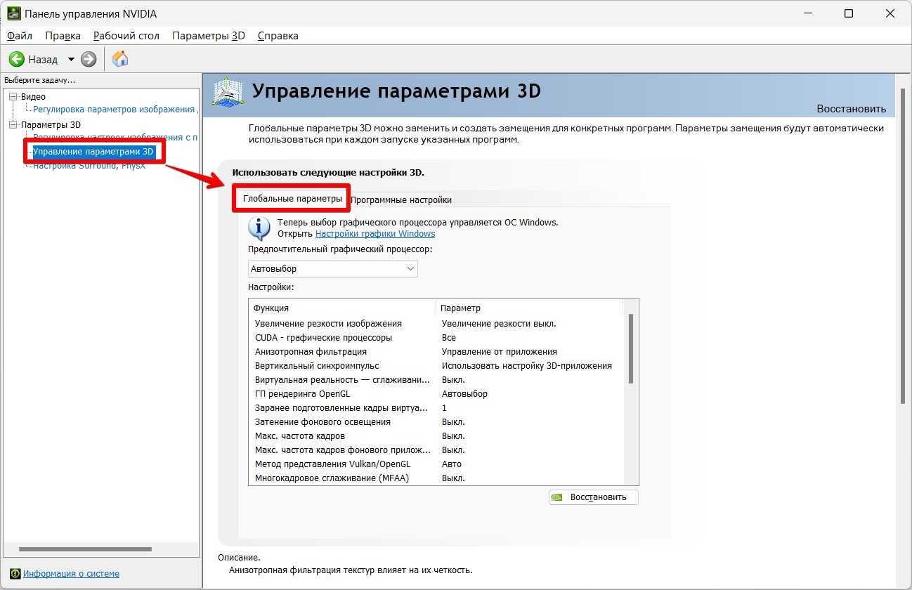 - В разделе «Управление параметрами 3D» на вкладке «Глобальные параметры» мы и видим основные настройки. Здесь же на вкладке «Программные настройки» можно задать отдельные настройки для конкретного приложения.