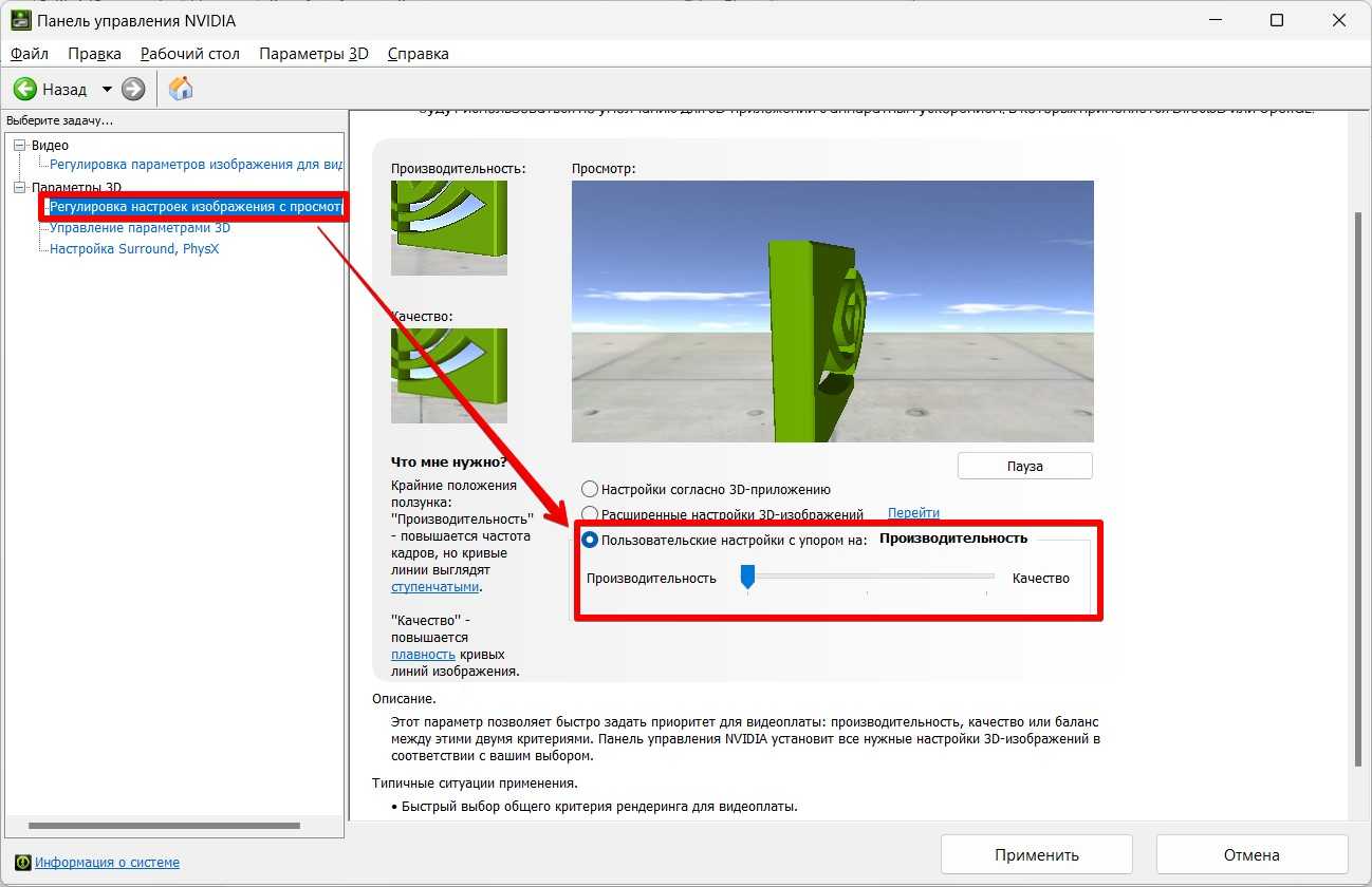 А еще здесь же в разделе «Регулировка настроек изображения с просмотром» можно переключиться на «Пользовательские настройки» и перетянуть ползунок на «Производительность». Такое тоже может неплохо поднять FPS во всех играх.