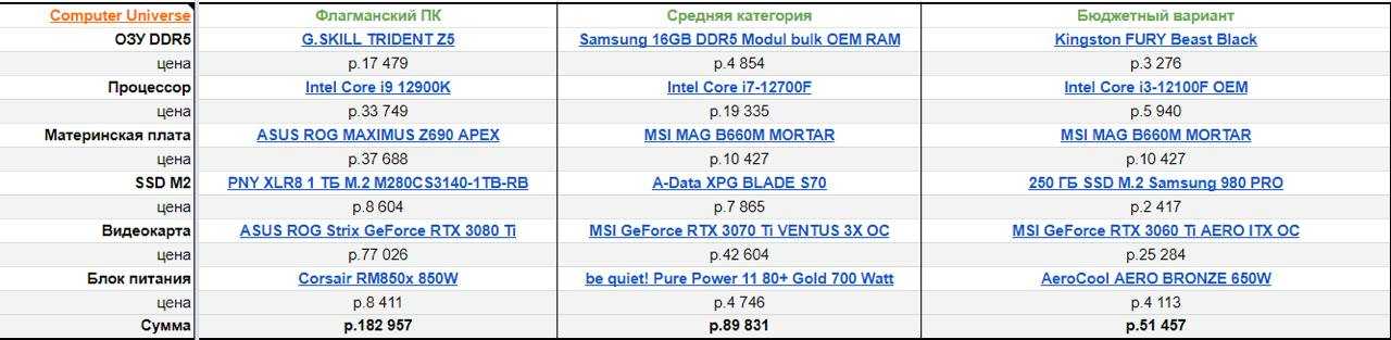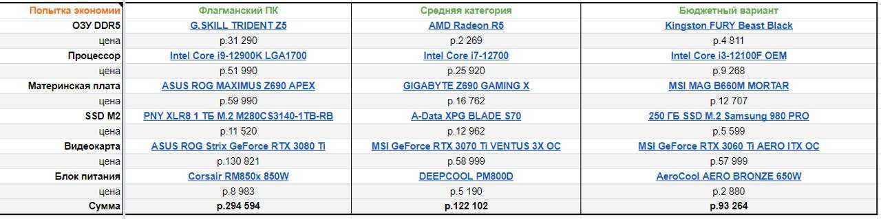 Эта часть делится на три подчасти. В первой таблице я пытаюсь найти те же самые комплектующие по России, но дешевле.