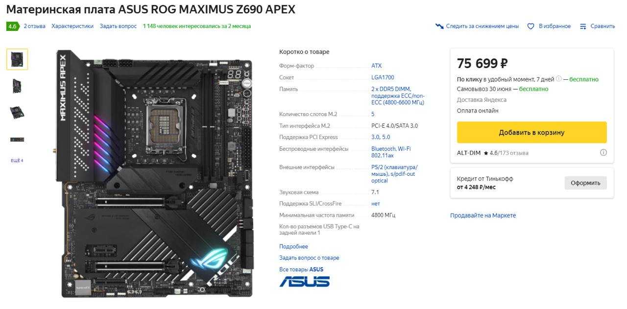 Выбор пал на материнскую плату ASUS ROG MAXIMUS Z690 APEX, потому что среди предложенных она одна поддерживает частоту 6600 МГц.