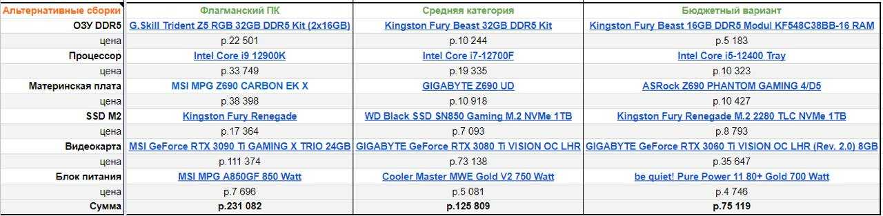 В среднем сегменте не удалось найти ОЗУ и БП, поэтому заменилось на аналоги по спецификациям.