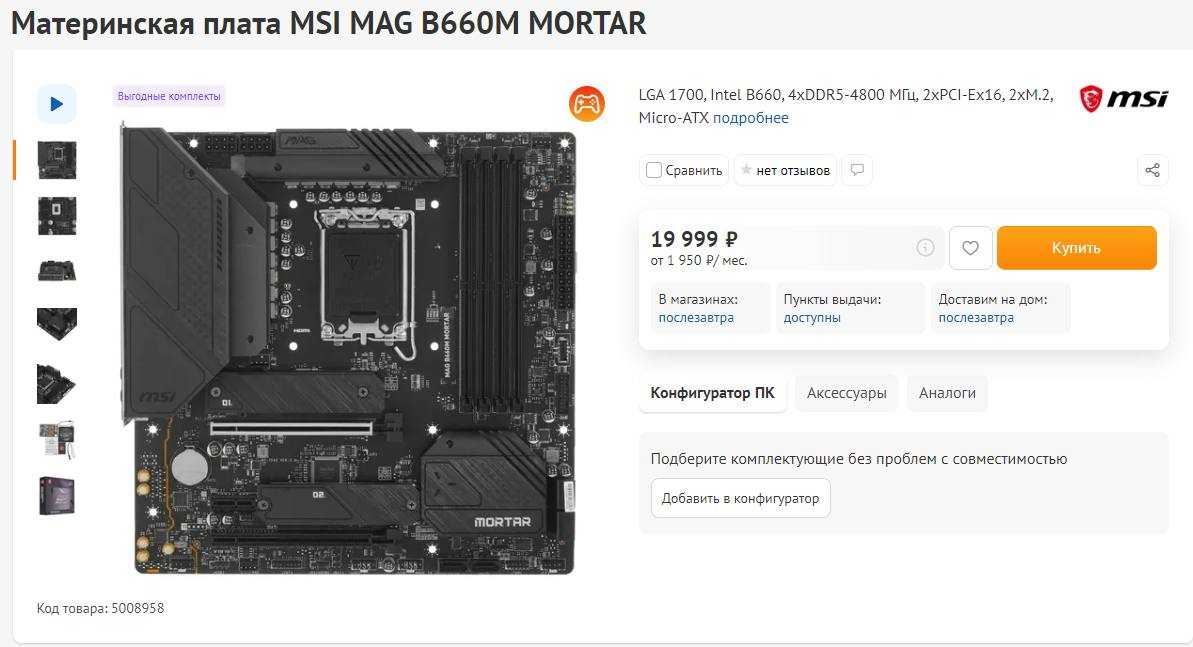 Материнская плата. А вот тут интересно: LGA 1700, Intel B660, 4xDDR5-4800 МГц, 2xPCI-Ex16, 2xM.2, Micro-ATX