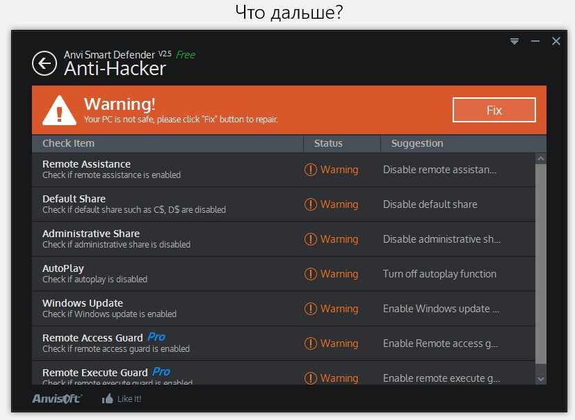 В разделе «Антихакер» запускается проверка на типичные проблемы настроек безопасности. По ее результатам предлагается отключить автозапуск со съемных носителей, службу удаленного администрирования, удалить созданные по умолчанию общие сетевые ресурсы и так далее. Работает этот инструмент примерно как «Мастер поиска и устранения проблем» в AVZ.