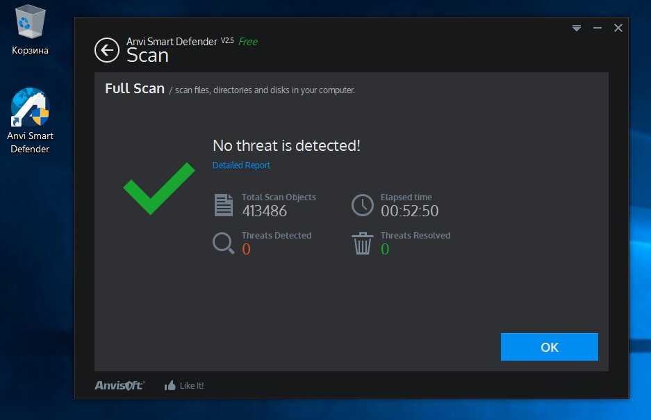 При первом запуске Anvi мы провели рекомендованное быстрое сканирование, а заодно убрали напоминание о нем. Скан чистой «десятки» завершился за шесть минут. При этом было проверено 312 тысяч объектов.