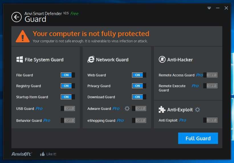 На вкладке с настройками проверки в режиме реального времени по умолчанию все компоненты включены. Однако на ней постоянно отображается уведомление о неполной защите компьютера. Это такой своеобразный стимул приобрести платную версию с дополнительными функциями. Пока не купишь все продукты Anvisoft, защита будет считаться недостаточной.