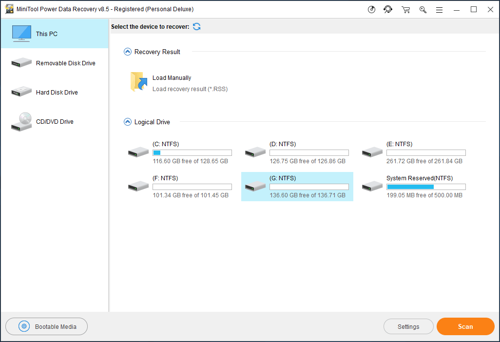 Step 1: Run MiniTool Power Data Recovery in Windows 10/8/7, and then choose a proper recovery module. Here, use its This PC feature. And then, choose the target drive to scan.