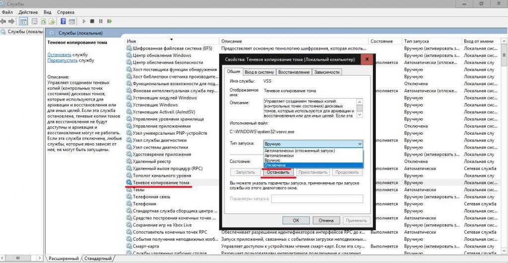 В редакторе необходимо найти соответствующую службу, зайти в ее настройки, используя для этого двойной клик или меню ПКМ, после чего, скажем, для деактивации теневого копирования нужно выполнить несколько действий, но обязательно в следующем порядке:
