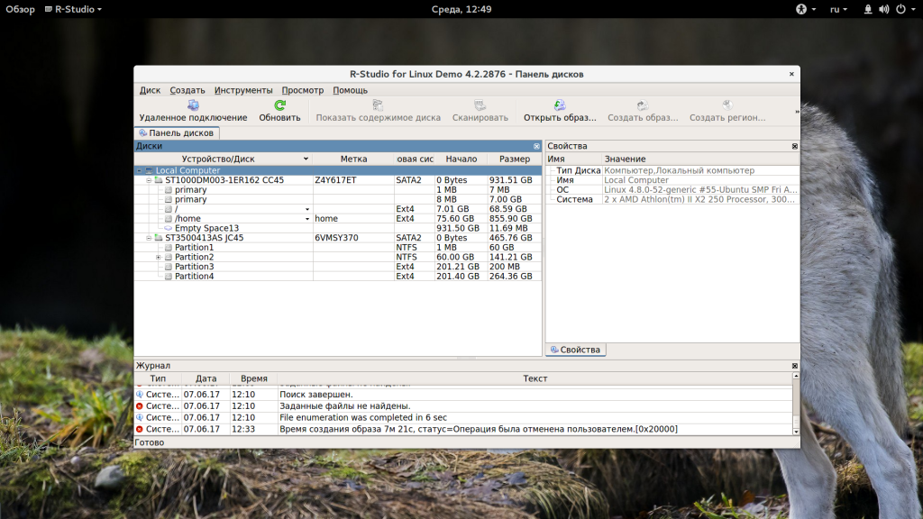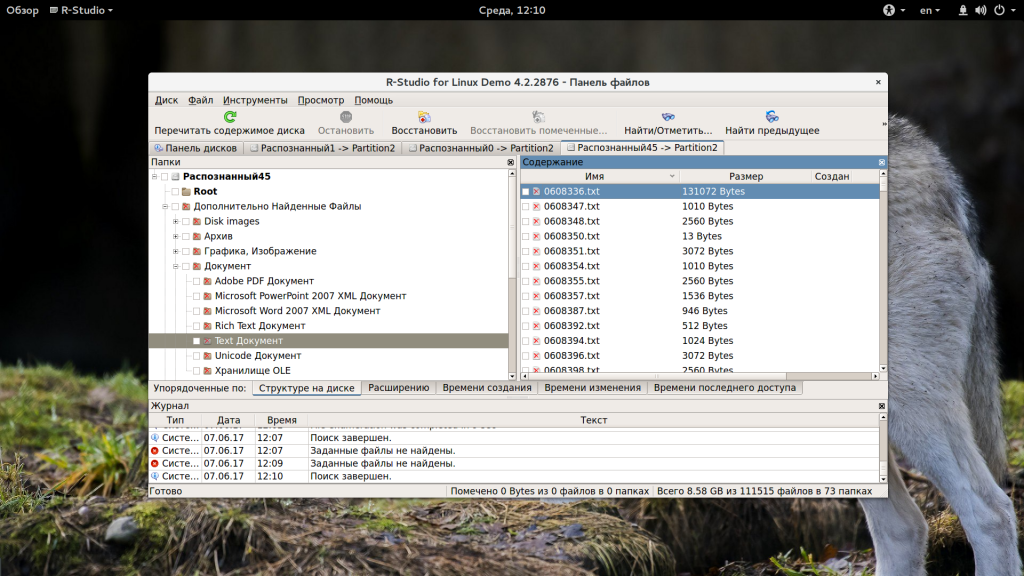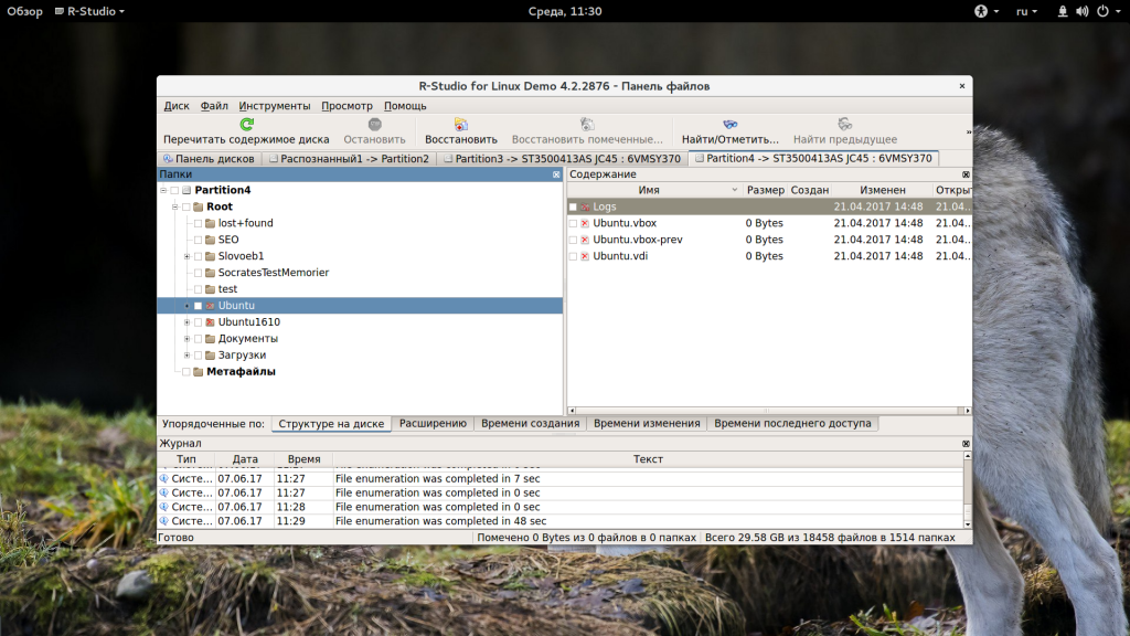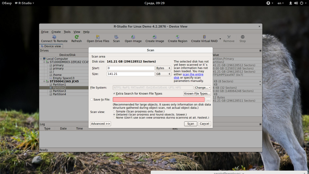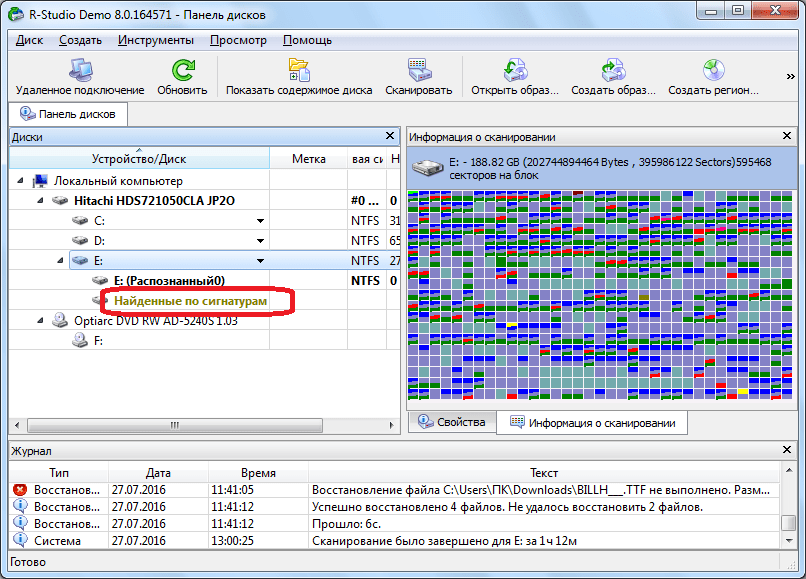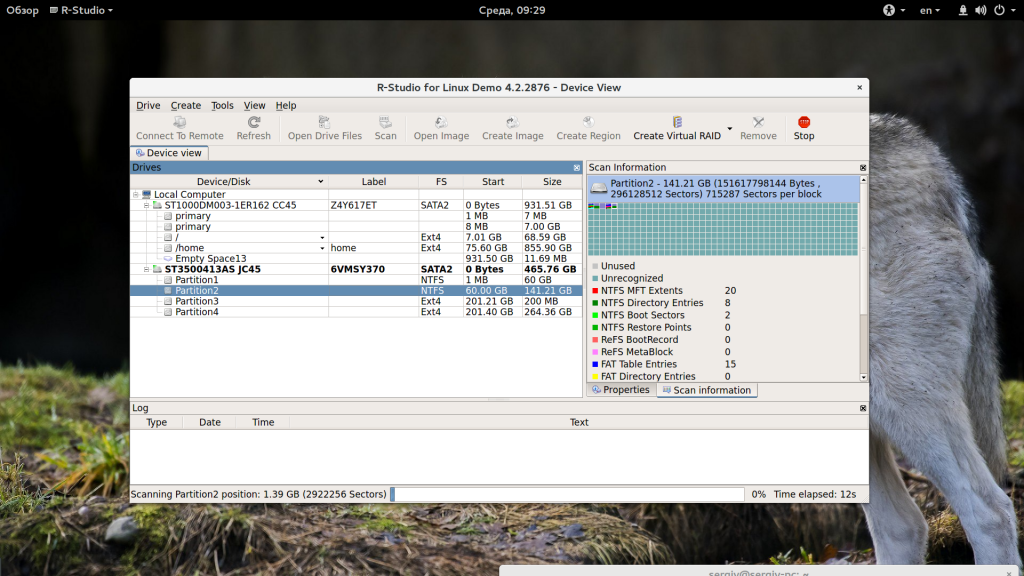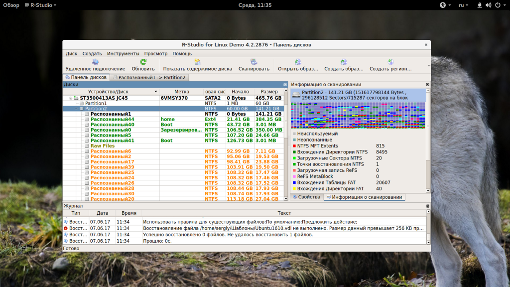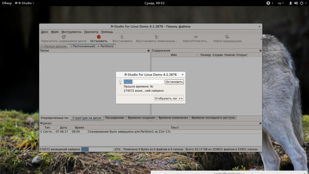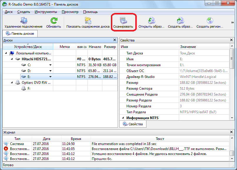 Если вы хотите восстановить все данные, нужно просканировать нужный раздел, чтобы обнаружить все файловые системы, которые там были и с которыми может работать утилита. Для этого выберите нужный раздел и нажмите кнопку «Сканировать». Этот процесс может занять длительное время, прогресс будет отображаться в правой части рабочей области: