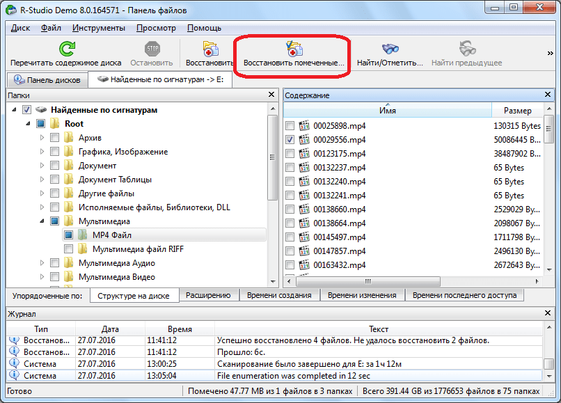 Рис 7. Можно восстановить все файлы или пометить галочками нужные