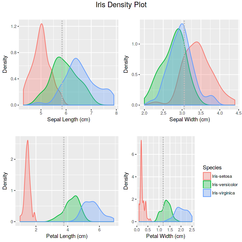 - Богатые возможности визуализации: можно создавать приложения, строить графики разных типов, в том числе интерактивные, а также редактировать их элементы. Например, график на основе известного датасета iris, показывающий плотность лепестков и чашелистиков в зависимости от вида ирисов.