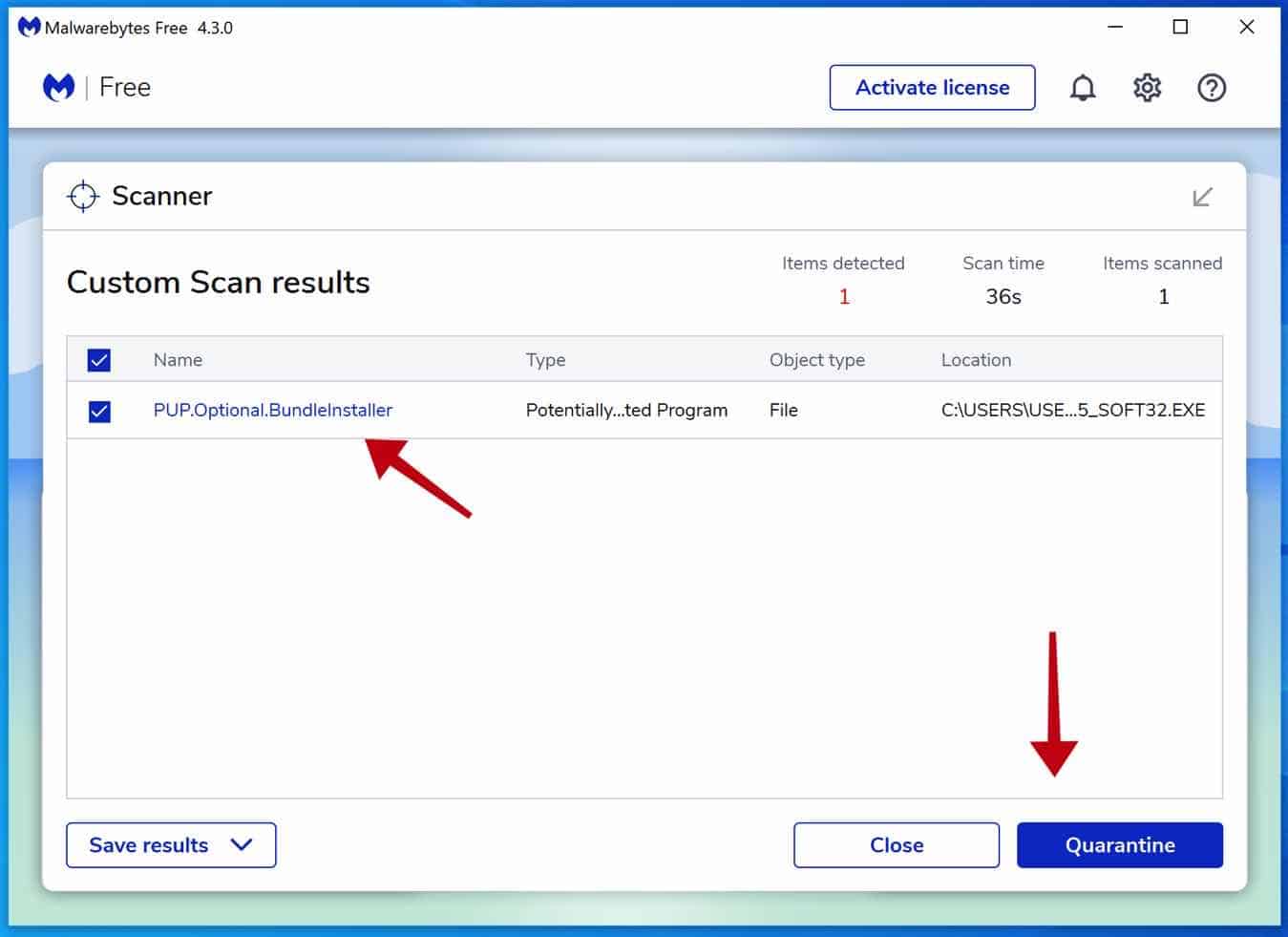 - После завершения просмотрите PUP.Optional.BundleInstaller обнаружение.