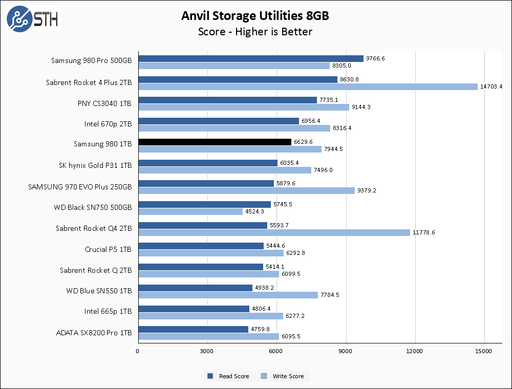 In Anvil, the Samsung 980 1TB lands squarely in the middle of our benchmark pack, though trending towards the upper end of the PCIe 3.0 crowd. Notable here is the write performance, which is especially admirable given the lack of a DRAM cache.