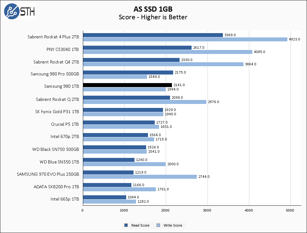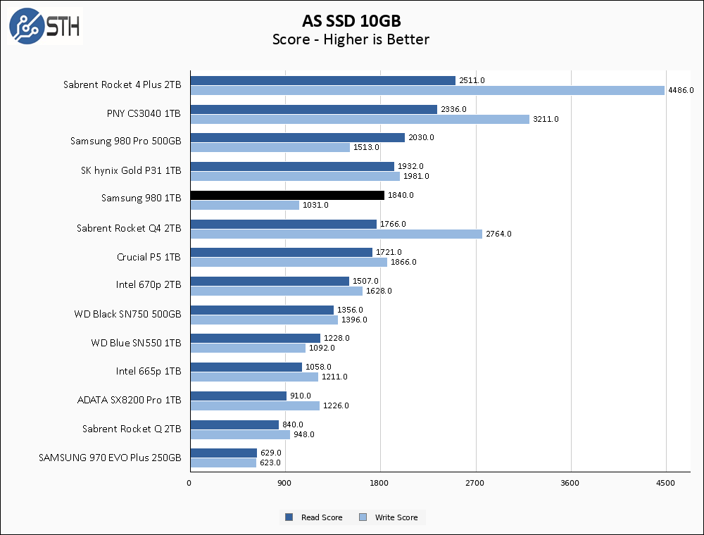 The good fortune is not to last though, as moving to the larger AS SSD test showcases a somewhat precipitous drop in write score for the 980 1TB. The bulk of the loss comes from dramatically slower 4K-64 Thread results.