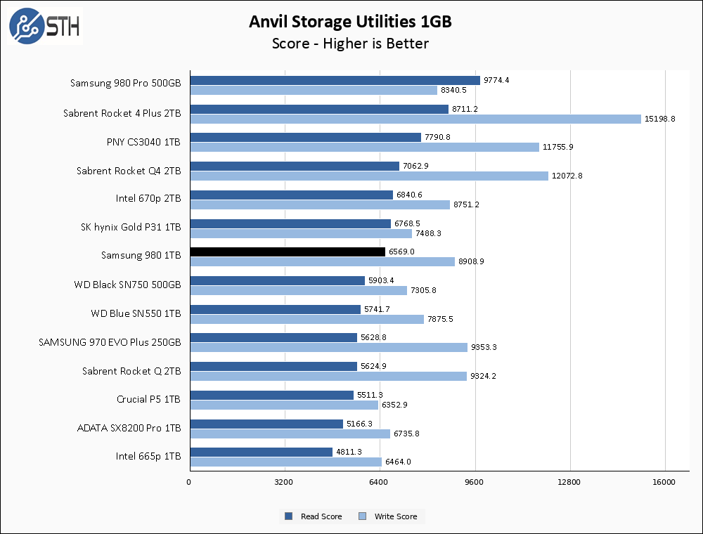 Finally, we have a minor bit of movement from the larger test set, with the 980 1TB losing a bit of ground on the write score relative to the smaller test. Overall though, the drop is minor and does not really affect the relative positioning of the drive on our chart.