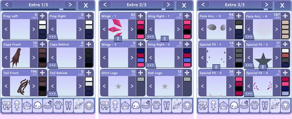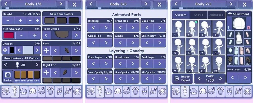 Bottoms: Select from a range of bottoms, including pants, skirts, shorts, and leggings, to complement your character’s outfit.