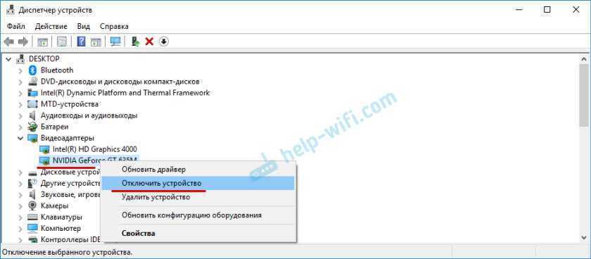 Помогло отключение дискретной видеокарты в диспетчере устройств. Не знаю, насколько это правильное решение, ведь мы по сути отключаем производительный видеоадаптер. Но похоже, это работает. Можете попробовать. Заходим в диспетчер устройств и отключаем дискретную видеокарту, оставив работать интегрированную.