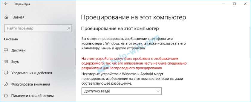 В более старых версиях Windows 10, когда система «понимала», что нет поддержки Miracast, то выводилось сообщение «ПК или мобильное устройство не поддерживает Miracast, поэтому беспроводное проецирование с него невозможно».