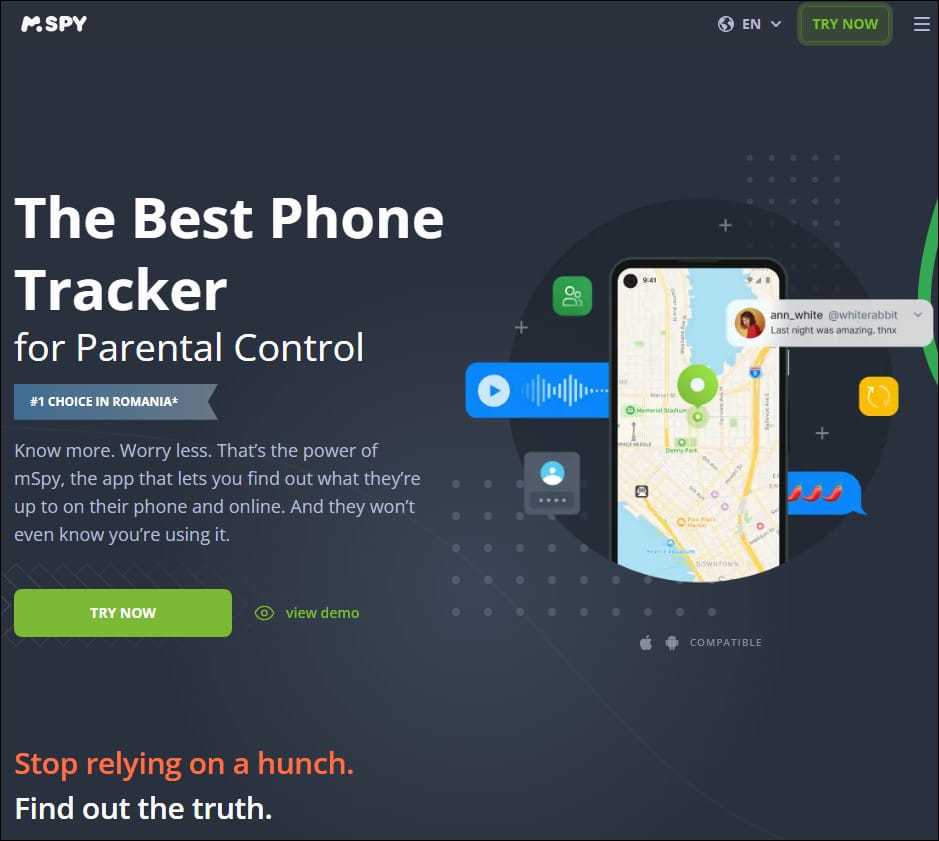 mSpy – первая в обзоре и по популярности в США (если верить разработчикам) программа шпион для Андроид и iOS. Ее главное назначение – ненавязчивый, точнее, тайный родительский контроль за подростками. mSpy не только ведет мониторинг практически всех действий на телефоне, но и дает возможность контролирующему лицу (родителю) блокировать работу приложений кликом мыши. Например, закрыть мессенджер или социальную сеть, если ребенок переписывается с незнакомцем.
