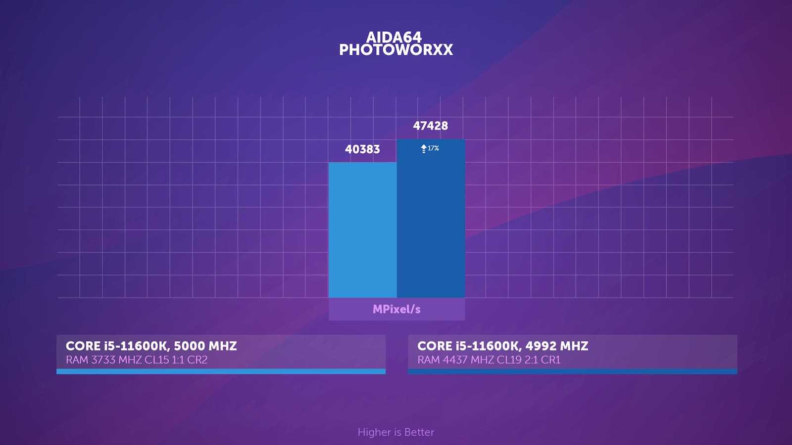Но PhotoWorXX в Aida 64 доказывает обратное. Здесь имеем 17-процентное преимущество высокочастотного режима над низкочастотным вместо 15%, как это было на однорангах.