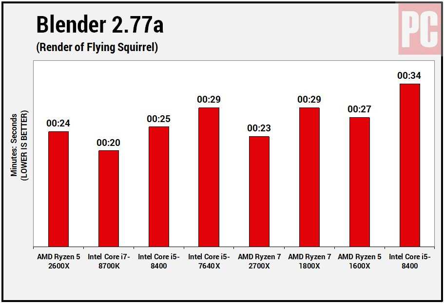 Процессоры Intel, по-видимому, хорошо работают в Blender, при этом наивысший балл у Core i7-8700K. Следующий лучший результат достается Ryzen 7 2700X. На третьем месте, всего за секунду после Core i5-8400, находится звезда сегодняшней программы Ryzen 5 2600X.