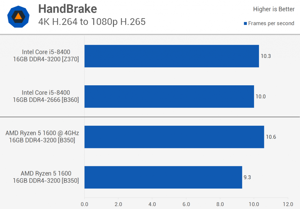 Затем у нас есть тест 7-zip, и здесь запас R5 1600 был на 15% быстрее, чем 8400 при выполнении компрессионных работ, но на 40% быстрее для декомпрессии. Сопряжение 8400 с более высокой скоростью памяти улучшило его производительность в этом тесте примерно на 2%. Разгон процессора Ryzen увеличился на 8-15%, придав ему значительное преимущество над Core i5-8400 в этой рабочей нагрузке.