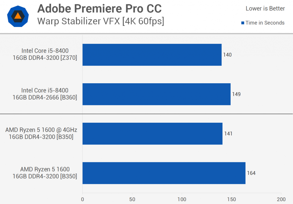 Однако, когда дело доходит до редактирования, как я уже отмечал ранее, глядя на результаты PCMark, производительность более конкурентоспособна. Как правило, эти задачи редактирования не полностью используют потоковые тяжелые процессоры Ryzen, и мы точно видим это при использовании эффекта стабилизации Warp в Premiere. Несмотря на то, что производительность обоих процессоров максимизирована, мы получаем аналогичный результат.