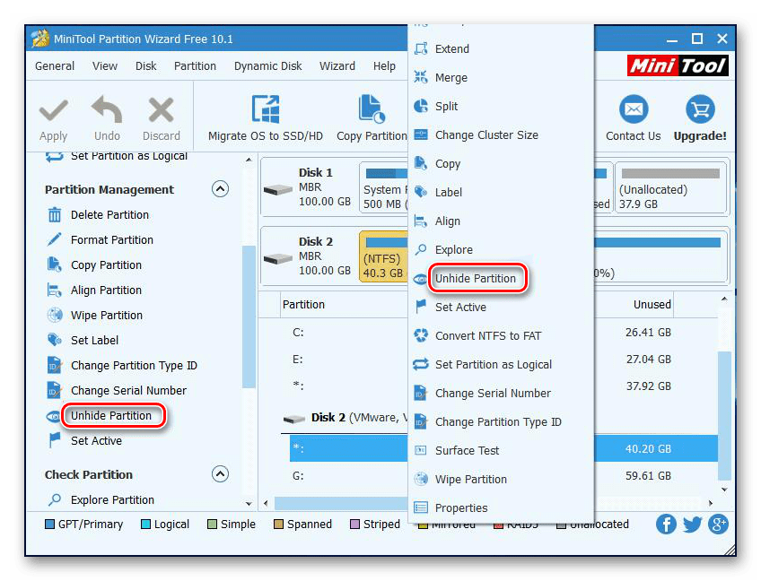 Иногда SSD не отображается в Windows из-за наличия в нем скрытого раздела. Это возможно, если пользователь скрыл том с помощью стороннего ПО, чтобы предотвратить возможность доступа к данным. Решением является восстановление раздела при помощи софта для работы с дисками. Тот же MiniTool Partition Wizard хорошо справляется с такой задачей.