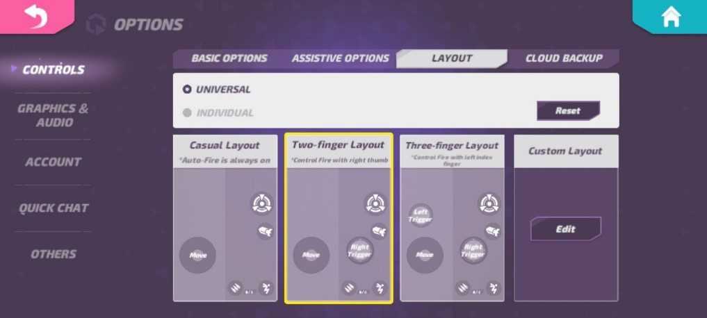 - Two fingers Layout is where you can do both auto fire and tap the fire button using your right thumb manually