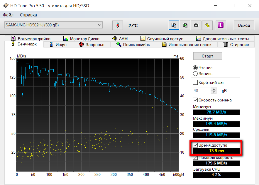 Время доступа определяет с какой скоростью диск находит требуемый файл после получения запроса от какой-либо программы или операционной системы. У обычных жестких дисков этот показатель находится в диапазоне 10-19 мс (миллисекунд), значительно влияет на отзывчивость системы и скорость копирования мелких файлов.