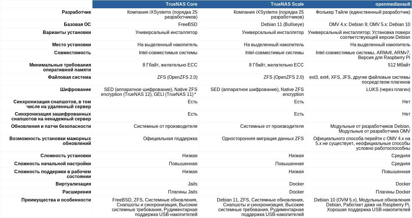 Таким образом, на сегодняшний день выбор стоит между тремя похожими, но очень разными системами: TrueNAS Core, TrueNAS Scale и openmediavault. Для начала приведу таблицу, в которой сравниваются выбранные мной ключевые параметры трех систем.