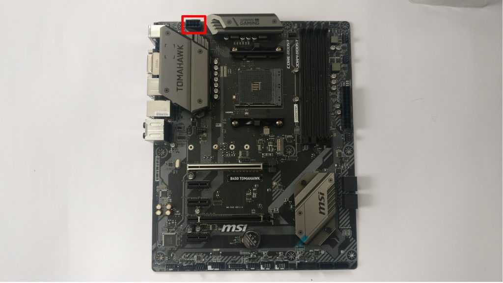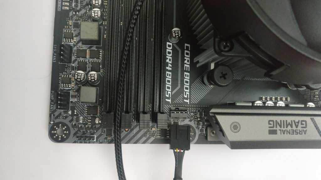 Далее вставьте трехпиновый коннектор питания кулера в специальный разъем на материнской плате, на B450 Tomahawk он находится справа от сокета процессора и подписан как CPU_FAN: