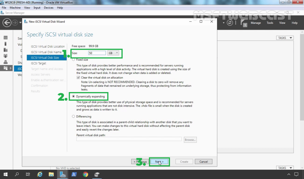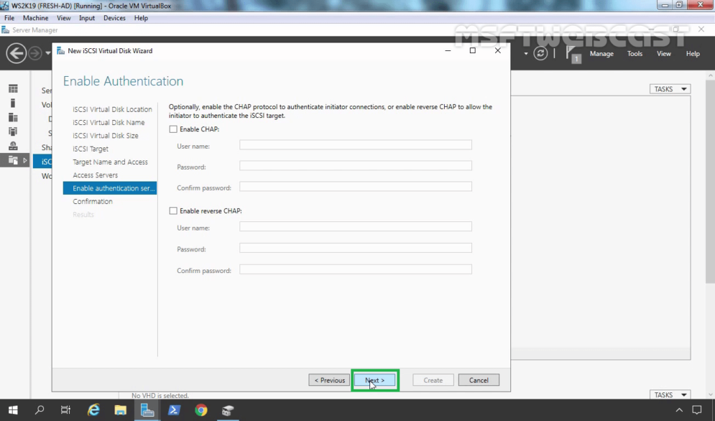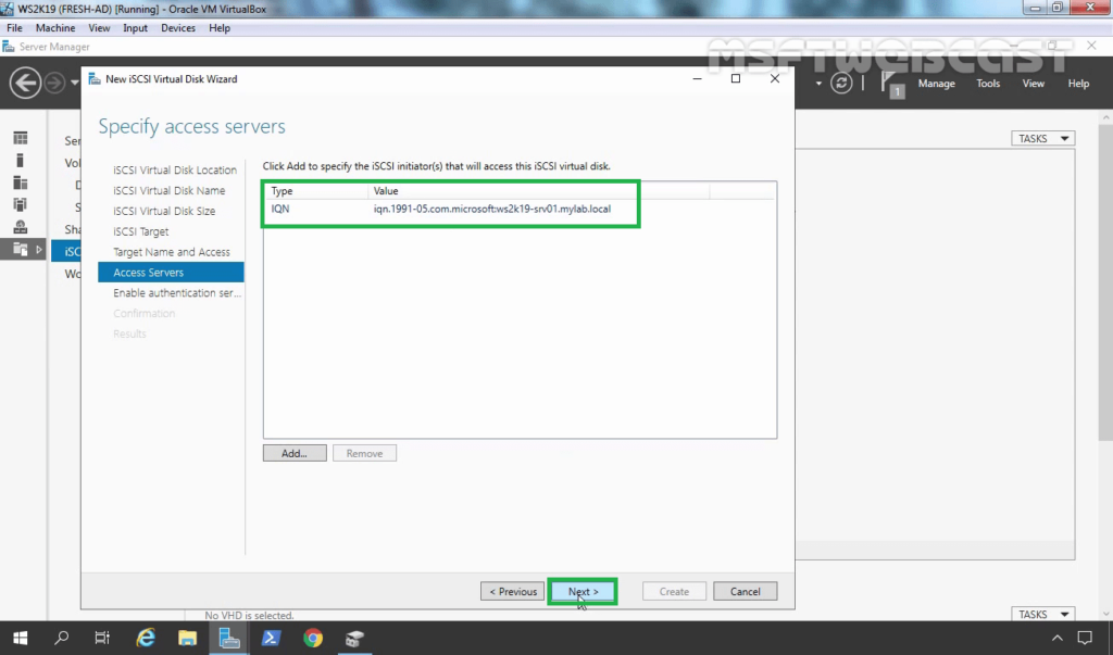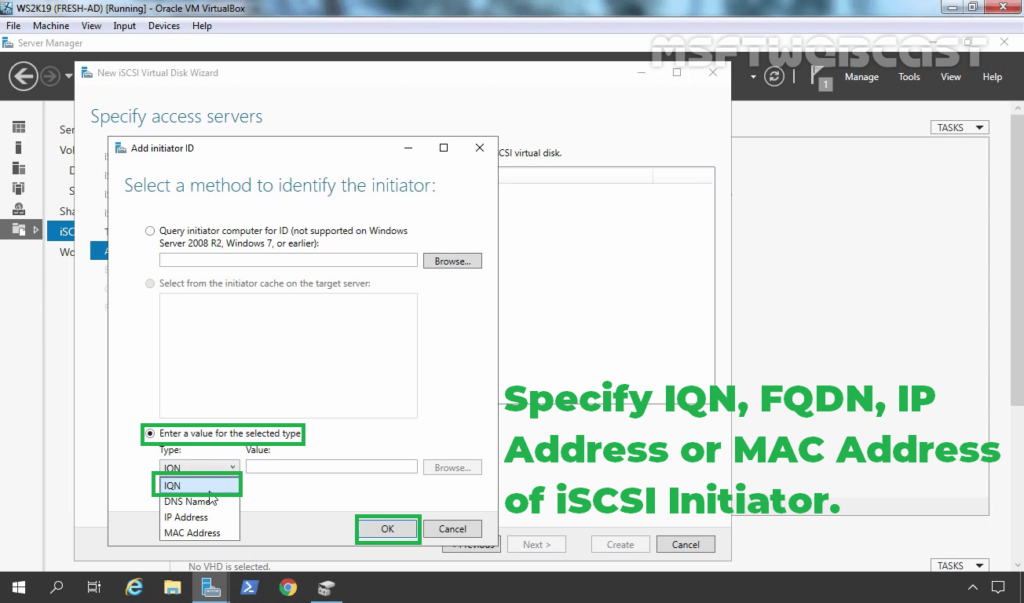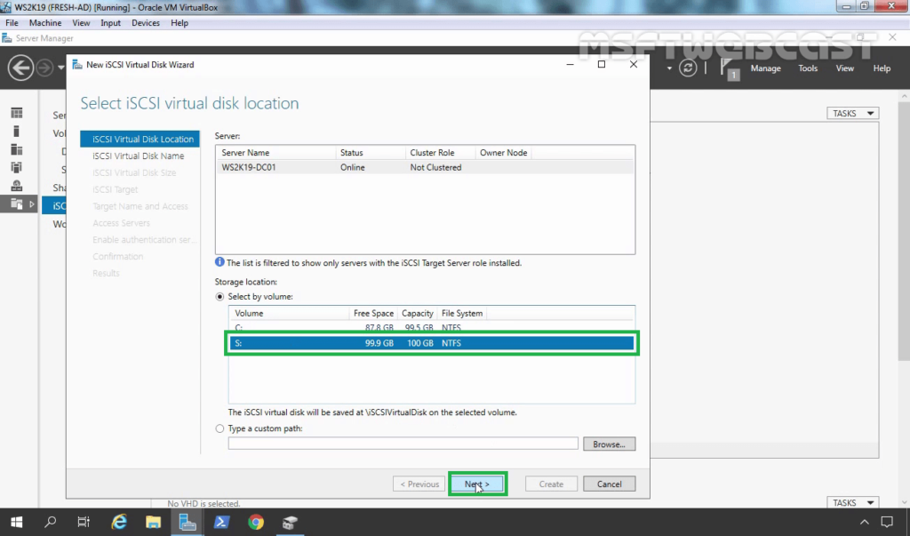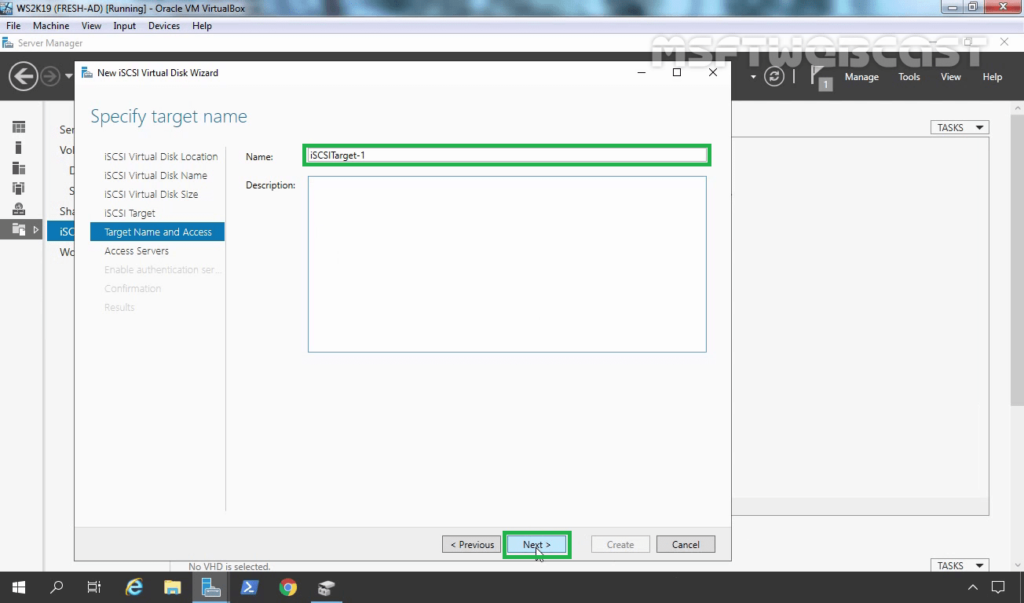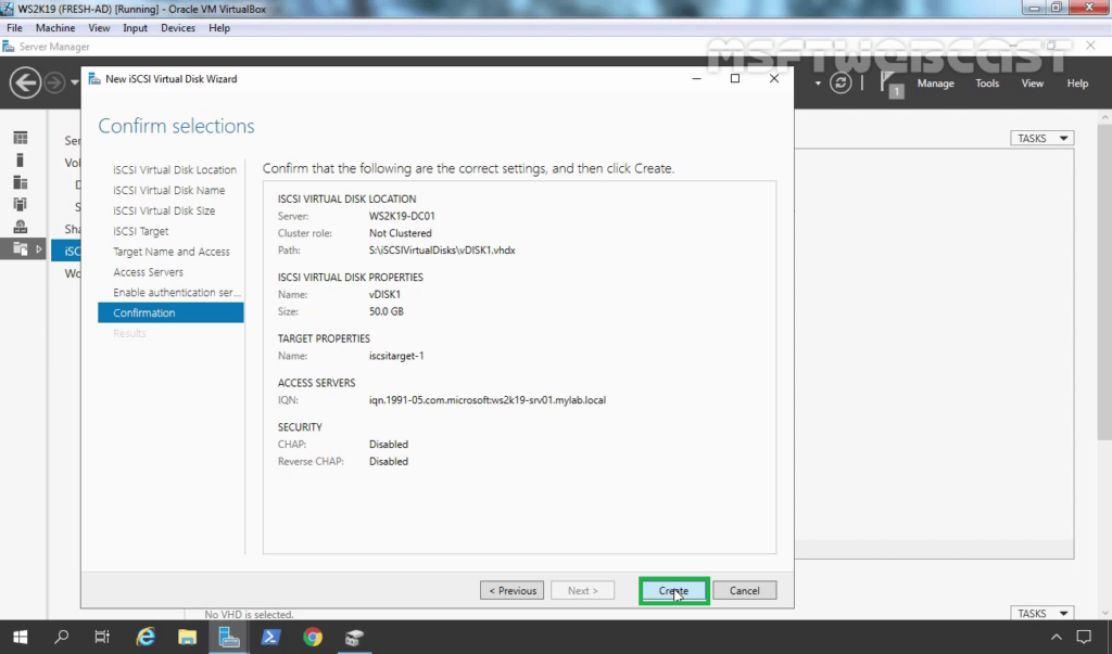 Select iSCSI and click To create an iSCSI virtual disk, start the New iSCSI Virtual Disk Wizard.