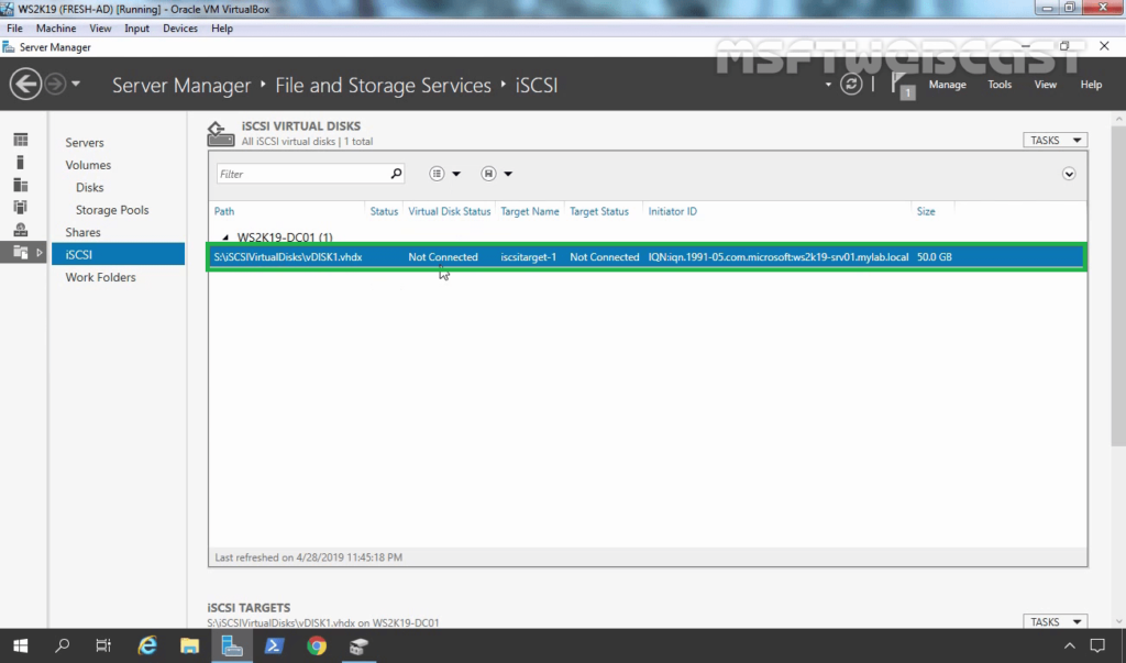 The other server is going to be used as the iSCSI initiator. This is the server that connects to the SAN. After connecting to the SAN, the iSCSI initiator sees an additional disk device.