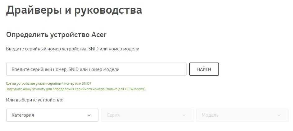 Переходим на сайт. Вы можете выбрать устройство вручную чуть ниже – указываем категорию, серию и номер. Или вы можете ввести серийный номер или SNID в строку выше. После этого указываем тип операционной системы и скачиваем дрова.