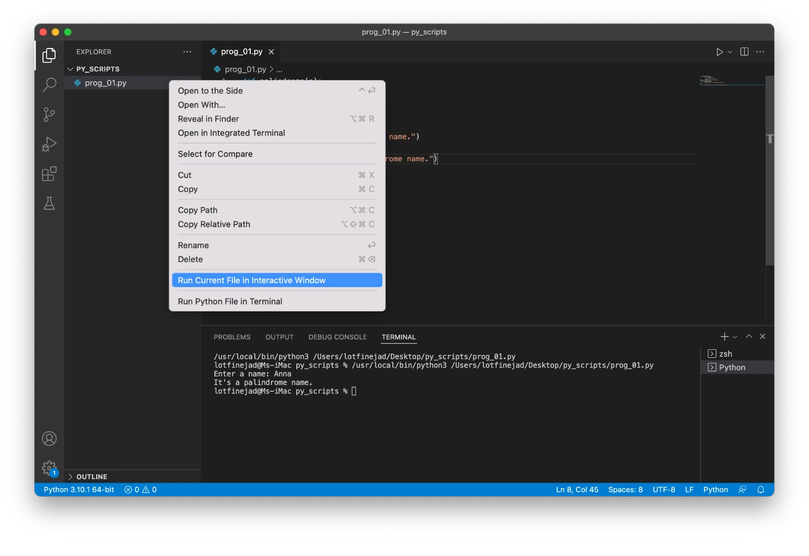 If the Jupyter package hasn’t been installed yet, it displays a dialog box and asks you to install it: After the installation, an interactive window will appear, and in this case, you need to enter a name to check if it is palindrome or not: Finally, you can see the result in the interactive window, as follows: Moreover, to create a new Jupyter Notebook in VS Code, open up the Command Palette, and select Jupyter: Create New Jupyter Notebook, as follows: It will create a new Jupyter Notebook, and you can simply create markdown and code cells in VS Code: