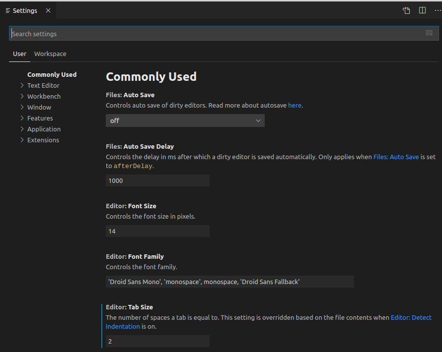 - Workspace: Settings are stored within project or workspace folder. They will apply only in that specific project.