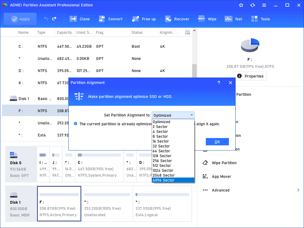 - If the partition is already aligned correctly, AOMEI Partition Assistant will give you information to notify you as «The current partition has aligned to the selected sector, and it does not need to align it again».