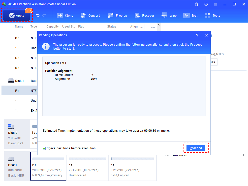 - Aligning partition will readjust the location of the data on that partition. If your partition contains a large amount of data, then the aligning operation will take a longer time to work it out. Notice viewing the estimated time of operation after clicking «Apply «.