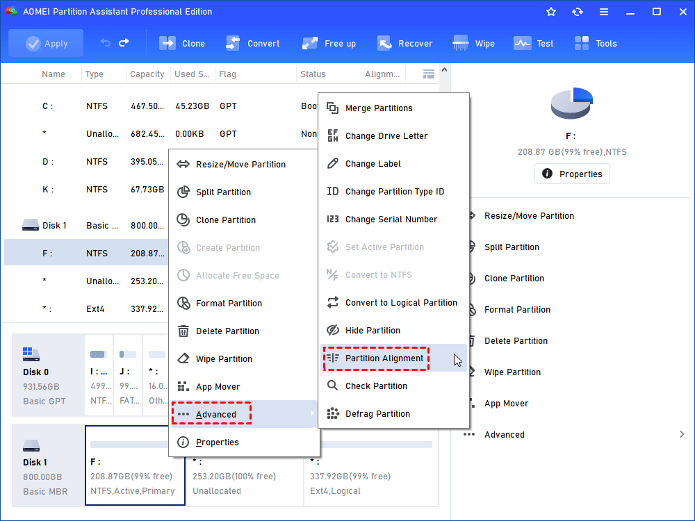- Before you perform the partition alignment task, we strongly recommend you to check if there are any errors on that partition. Follow these steps to check partition: AOMEI Partition Assistant -> Partition Menu -> Advanced -> Check Partition.