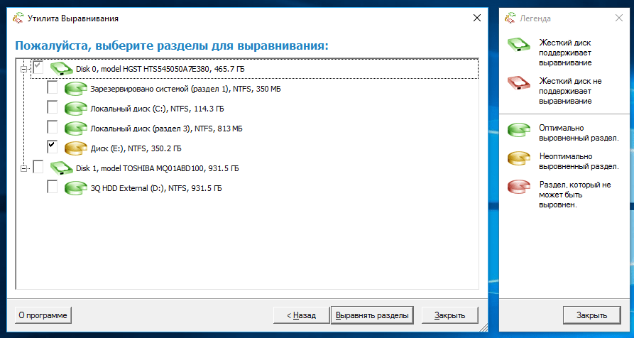 В левом верхнем углу окна программы должны быть две строчки зелёного цвета, а цифра во второй строчке должна делиться на 4, всё это говорит о том, что разделы на выбранном жёстком диске выровнены корректно, например